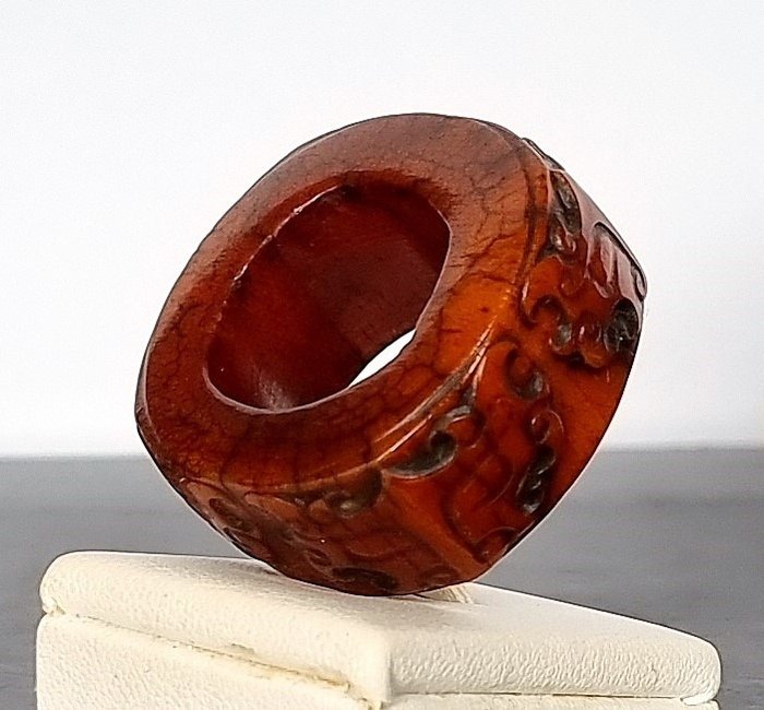 Ring, ring, gesneden met het dierenmasker van Taotie - tāo tiè wém - (饕餮紋), voorstellend op 4 gemaskerde figuren met fijne archaïsche versieringen in reliëf.