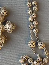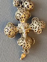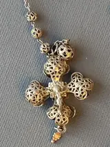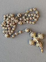 Mooie filigraan rozenkrans met filigraan kruis. Totaal lengte inclusief kruis is circa 35cm. Het totaal weegt 12 gram. Het is gemaakt van zilver 0.800 en heel erg klein gemerkt in het haakje.Het filigraan heeft aan é♪0n kant een jezus figuur, de andere kant lijkt meer op een opengewerkte bloem.