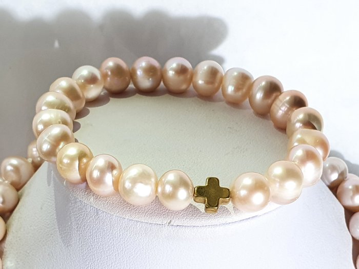 Ik bied ter veiling aan een exclusieve zeer lange ketting en armband van vergulde hematiet Griekse kruisen (bescherming & balans) en roze (natuurlijke kleur) zoetwaterparels van de hoogste kwaliteit. De hele ketting is met de hand gesponnen met knopen op elke kraal en kruis en de sluiting is gemaakt van verguld 925 zilver
