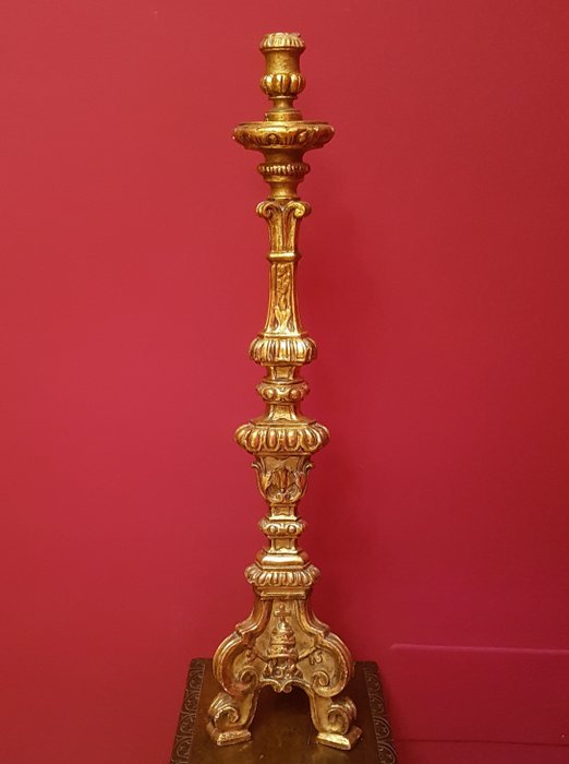 Prachtige en imposante fakkel gemaakt van hout en bladgoud, daterend uit het begin van de 20e eeuw, van verfijnd Italiaans vakmanschap van religieuze kunst uit die tijd.