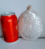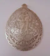 Antiek, geschulpt en uitgesneden parelmoer medaillon/schelp met de afbeelding van Sint-Jozef en kindje Jezus in de armen en meerdere engelen aan de zijkanten.