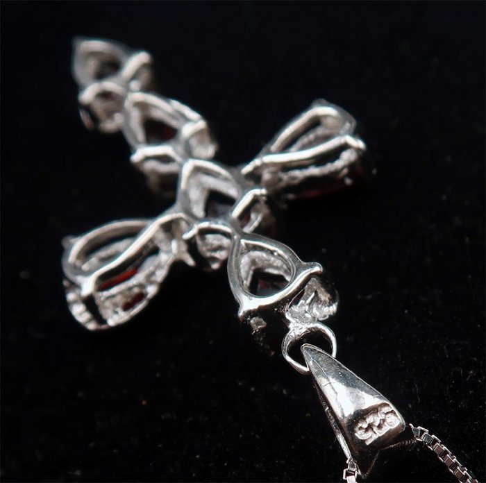 Massief 925 zilveren kruis versierd met granaten: 37,8*19,4*4,6 mm.