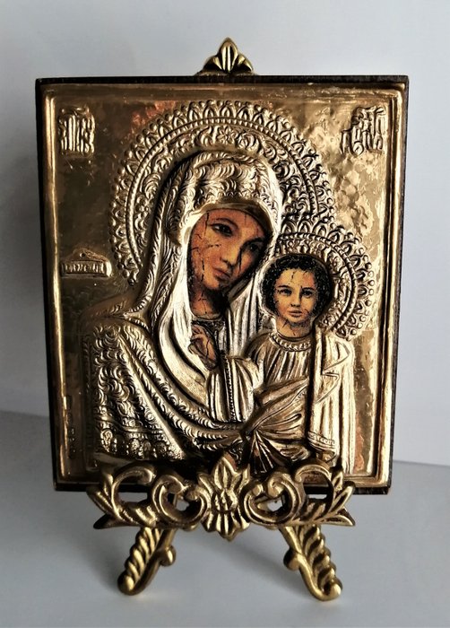 Set gevormd door twee oude Byzantijnse iconen waarvan een met een afbeelding van de Madonna met kind, Moeder van God en een met een afbeelding van Jezus, gelamineerd in 925 zilver op een houten voet en een mooie koperen standaard, alles in goede staat, lichte gebruikssporen.