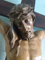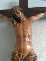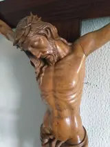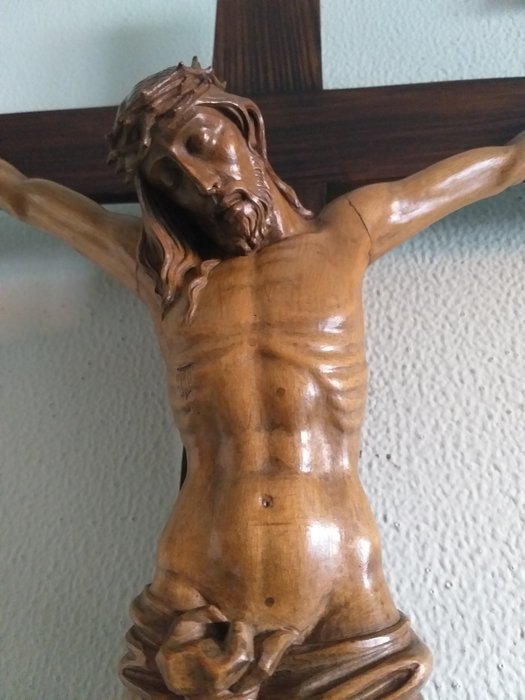 van gekruisigde Jezus gemaakt van buxushout uit de 19e eeuw, het uitstekende snijwerk heeft veel details in de handen, gezicht, benen etc. wat het geheel veel realisme geeft. De totale afmetingen van het kruis 88 cm x 47 cm en de afmetingen van de gekruisigde Jezus 48 cm x 36 cm. Gezien de grootte van het kruisbeeld wordt de verzending gepersonaliseerd verpakt.