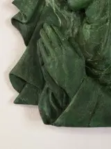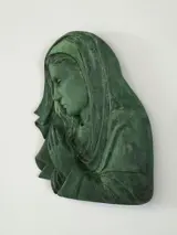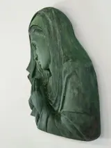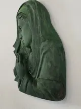Bas-reliëf van een gepatineerde Madonna met een antiek bronzen effect.