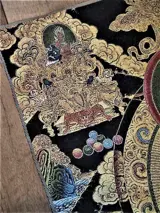 Door het rijkelijk verwerkte gouddraad in deze Thangka geeft deze bij kunstlicht een prachtige spirituele uitstraling.