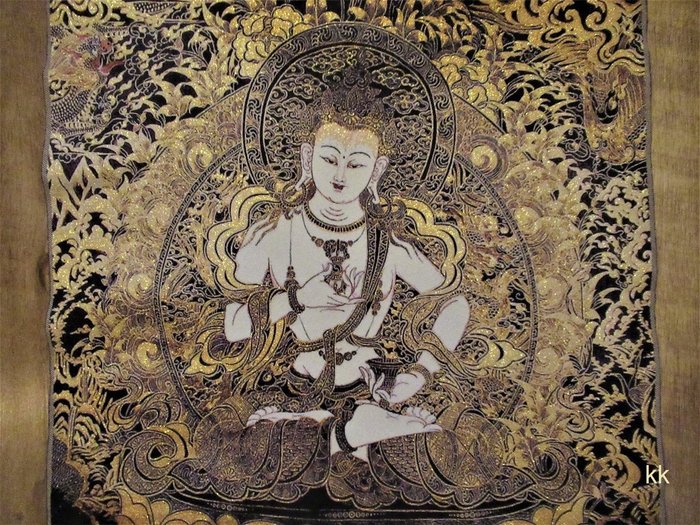Deze Thangka geeft bij kunstlicht door het veel verwerkte gouddraad een geweldige spirituele uitstraling. Zeer bijzonder.