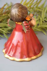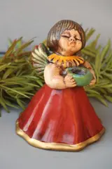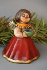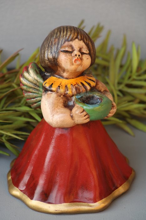 Een mooie engel van Thun Bozen, handgemaakt en ingekleurd, rood met groen. Opvallens zijn de groen rode vleugels van de engel. Gemerkt met merkje aan de binnenkant. De engel is 16cm hoog.