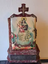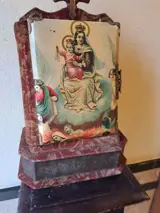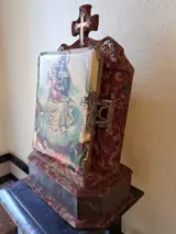 Uniek Antiek 1882 Religiese Triptiek Met Muziek Werkend , Opendraaiend Foto Album Met Brons Beslag, Geopend met Wijwatervat en 2 Porseleinen Beeldjes Heilig Hart Maria Jozef