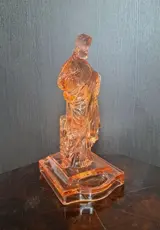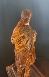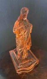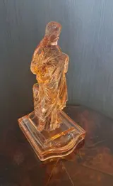 Sculptuur is gemaakt van roze/oranje glas en heeft een beschadiging aan voorzijde (heilige plek).