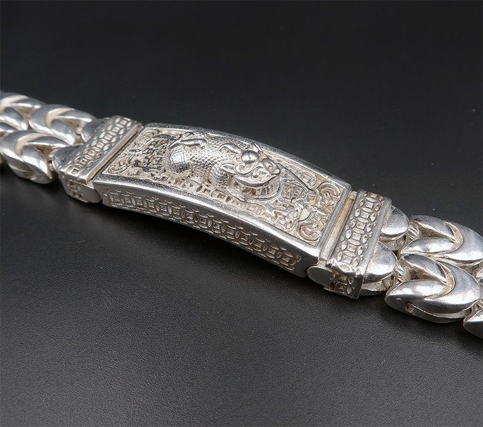 Armband met een dubbele rij schakels versierd met een Pi Xiu. Vervaardigde kliksluiting.