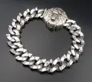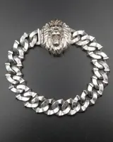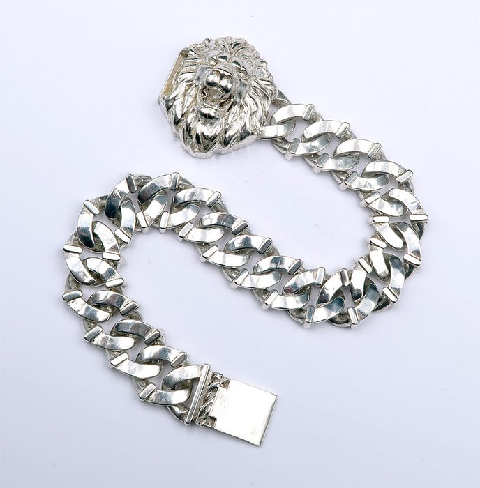 Armband met een rij gourmette schakels versierd met een leeuw. Kliksluiting.