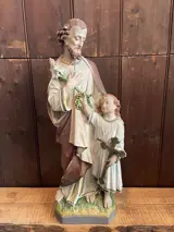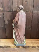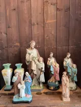Prachtige religieuze beelden. Er is nergens een stukje af. De foto’s maken deel uit van de staat van de objecten. Beeld 1 is 63cm hoog, beeld 2 is 46cm hoog, beeld 3 is 46cm hoog, beeld 4 is 33cm hoog, beeld 5 is 32cm hoog en de 2 kelken zijn 34cm hoog.