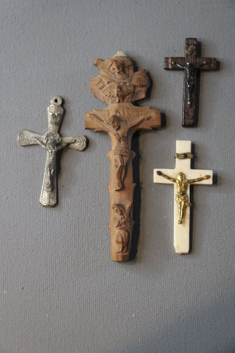 Vier verschillende kruisjes worden heir aangeboden. Allen in redelijke staat. Gemaakt van verschillende materialen.