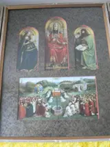 Tevens zien we een schaap op het altaar, Adam en Eva, engelen, gelovigen etc.