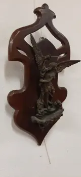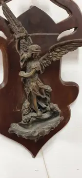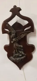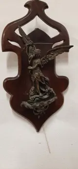 Bronzen stolp uit het begin van de 20e eeuw en stelt een Sint-Joris voor die een draak doodt. Dit bronzen gietstuk rust op een helder Art Nouveau houten paneel en heeft een haakje aan de achterkant om op te hangen. Ik denk dat de fusie is uitgevoerd met de kleitechniek en in een zeer goede staat verkeert, zonder gebreken of lijmen. Totale afmeting 42x21 cm.