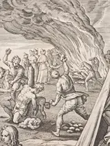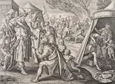 Je zult niet stelen; Joshua, ten voeten uit, staf vasthoudend, oordeelt Achan die voor hem knielt; rechts, de binnenkant van een tent met Achan aan het graven en op de achtergrond de steniging en verbranding van Achan en zijn familie.