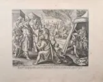 Linksonder nummer "VII" van de serie, "M. de Vos inven.", naar rechts "Ioan. Collaert sculp", dan tweeregelige Latijnse inscriptie "Filii autem.../...consumpta sunt" en "Iosue 7. hoofdstuk."