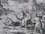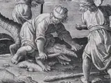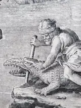 Op de voorgrond en daarbuiten vallen jagers aan de oever van de rivier de krokodillen aan door schrijlings op hun rug te gaan zitten en een stok in hun kaken te steken; anderen sloegen ze met knuppels.