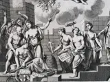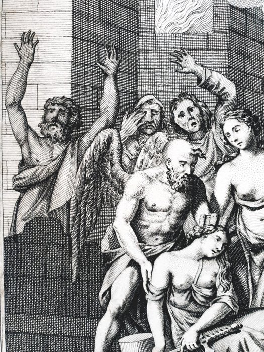 De vreemde figuur onder de voeten van de groep rechtsonder is Envy, knagend aan een hart en letterlijk ‘dampend uit haar mond’.