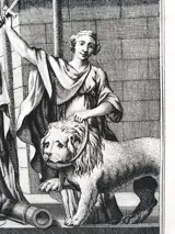 Zittend op gebroken metselwerk in de linkerbenedenhoek, met een zwaard in de hand, vrouwelijke figuur, die de City of London vertegenwoordigt. Ze zit boven een draak, al eeuwenlang het symbool voor de City of London.