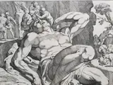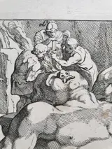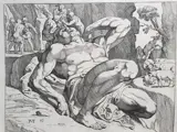 Plaat 10: Ulysses en twee metgezellen verblinden Polyphemus met een staak; naar Primaticcio en Niccolò dell' Abbate.