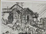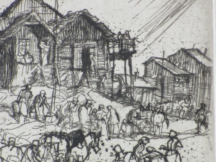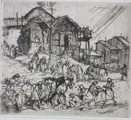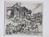 Signatuur en titel l.o. op passepartout: 'Frank Brangwyn, Dorpsgezicht'