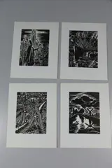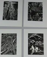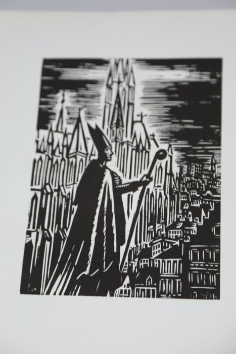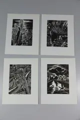 4 prachtige originele houtgravures van Frans Masereel. De platen zijn 24 bij 18,5 cm, de gravures zijn 15,5 bij 11,5 cm. Ze maken deel uit van de in 1964 uitgegeven bundel 'Mijn land'.
