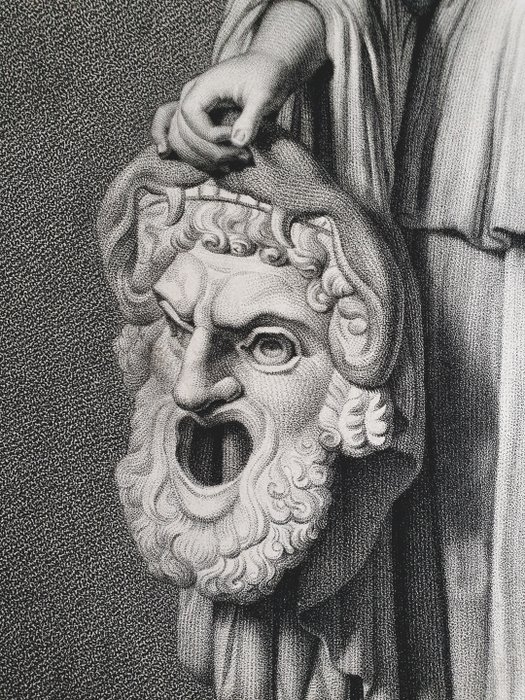 Naar het Romeinse standbeeld van Melpomene, 2e eeuw na Christus. De muze wordt getoond in een kledingstuk met lange mouwen en een hoge riem, kleding die werd geassocieerd met tragische acteurs. Haar krans van wijnstokken en druiven verwijst naar Dionysus, de god van het theater.