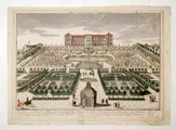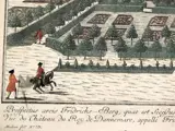 Prospectusblad met uitzicht op de zomerresidentie van de Deense koningen, kasteel Frederiksberg, met zijn tuin. Aanzicht vanuit het perspectief van de cavalier op een deel van de tuin dat naar achteren oploopt over meerdere terrassen en het kasteel op de achtergrond. Op de voorgrond ziet men enkele kleine kasten, waaraan een parterre met een groot bassin grenst. In de broderies zijn afbeeldingen van de koninklijke kroon verwerkt. Daarachter volgt een cascade die de tuin verbindt met het hoger gelegen kasteel. In de tuin staan talloze staffiguren in barokstijl, waaronder een tuinman met een spade. Onderaan staan de Latijnse, Franse, Italiaanse en Duitse titels. Rechtsonder staat het adres van de Augsburgse uitgever Georg Balthasar Probst (1732-1801). Linksonder staat het serienummer van de uitgever: 73. Rechtsboven staat het serienummer van de uitgever: 297. Uit een serie met vier gezichten op Kopenhagen. Uit Kapf 92. Het blad is een van de zeldzame peepshowbladen van de uitgever.