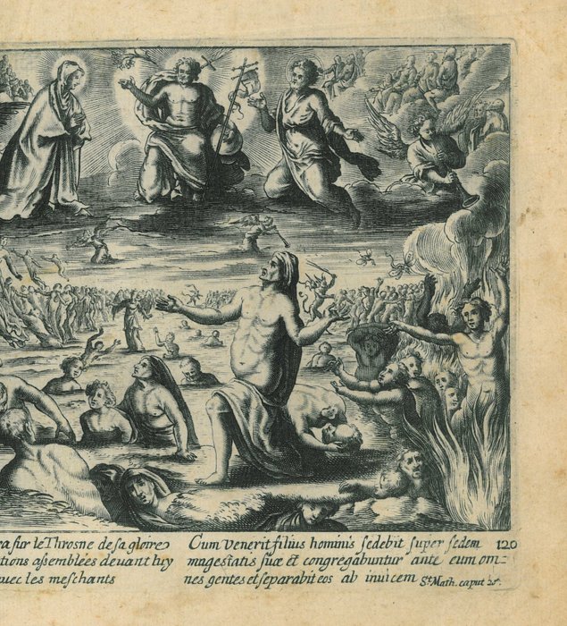 nDe Mensenzoon neemt plaats op zijn troon om de mensen te oordelen (Mattheus 25:31-46). Ets en gravure door een onbekende meester (mogelijk Jollain zelf?). Uitgegeven te Parijs door Gérard Jollain, ca. 1670. Met onderschrift in Latijn en Frans.nnGérard Jollain (werkzaam Parijs 1634-1683) was een graveur, prenthandelaar en uitgever te Parijs.nnRedelijk goede conditie. Mooie afdruk. Papier wat vuil en met kreukjes en lichte spotting. Enkele kleine scheurtjes langs randen. Enkele vlekjes. Verso: blank, met restant van een vroegere bevestiging.nnnDe tekst uit het Evangelie luidt (Mattheus 25:31-33):nWanneer de Zoon des mensen komen zal in Zijn heerlijkheid en al de heilige engelen met Hem, dan zal Hij zitten op de troon van Zijn heerlijkheid. En vóór Hem zullen al de volken bijeengebracht worden, Hij zal ze van elkaar scheiden zoals de herder de schapen van de bokken scheidt. En Hij zal de schapen aan Zijn rechterhand zetten, maar de bokken aan Zijn linkerhand.nnZie ook de scans.nnVerzekerde verzending.NULL NULL NULL 2023-02-22 09:37:42 2023-02-22 09:46:32