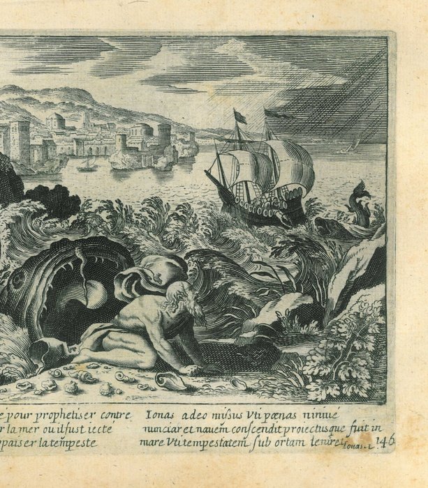 nHet verhaal van Jona en de walvis. Ets en gravure door een onbekende meester (mogelijk Jollain zelf?). Uitgegeven te Parijs door Gérard Jollain, ca. 1670. Met onderschrift in Latijn en Frans.nnGérard Jollain (werkzaam Parijs 1634-1683) was een graveur, prenthandelaar en uitgever te Parijs.nnGoede conditie. Mooie afdruk. Papier iets gebruind en iets vuil. Lichte spotting/kleine vlekjes. Verso: blank.nnZie ook de scans.nnVerzekerde verzending.NULL NULL NULL 2023-02-22 09:55:36 2023-02-22 09:57:46