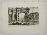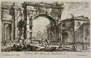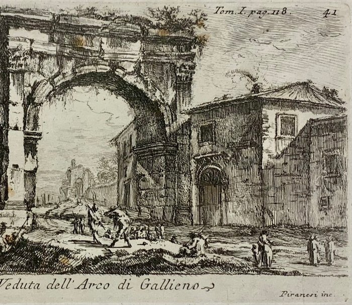 Zicht op de Boog van Gallienus. Op de voorgrond de monumentale boog, getekend door het verstrijken van de tijd en door vegetatie. Links een klassieke architectuur met een grote deur. Aan de rechterkant enkele kleine huisjes en een lange muur die ontsnapt langs het perspectief voorbij de boog. Talrijke reizigers bevolken het tafereel. Titel en plaatsignatuur in de ondermarge. Romeinse editie watermerk met lelie. Compleet blad van 20x27cm, slag 13x18cm.
