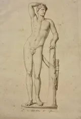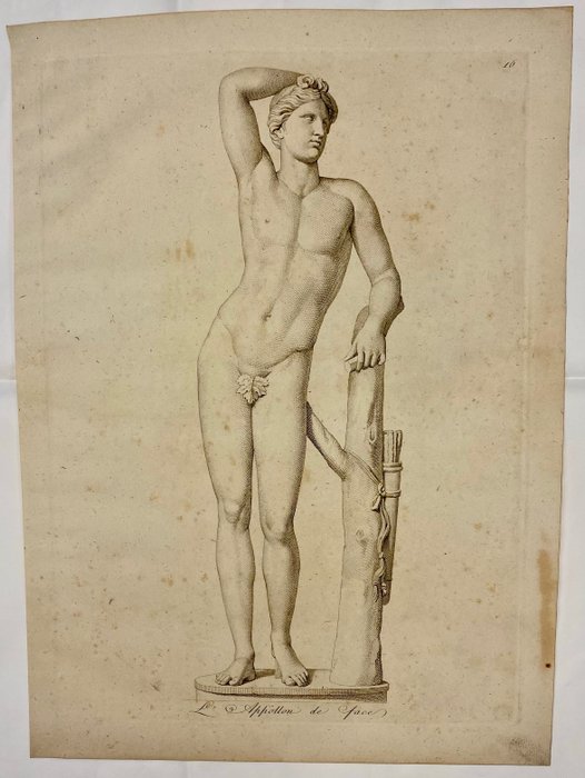 Burijn gravure van een sculptuur van Apollo gezien vanaf de voorkant. De linkerarm rust op een kleine slurf waaraan een pijlkoker hangt. Het Romeinse beeld, een kopie van een Grieks beeld, wordt nu bewaard in de Vaticaanse Musea.
