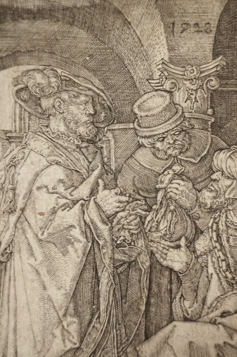 De gravure is aan de zijkanten onregelmatig uitgesneden