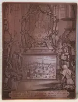 Koperplaat + afdruk van Jacobus Harrewijn (Amsterdam 1660-Brussel 1727). Beroemd kunstschilder, tekenaar en vooral graveur, vooral actief te Brussel waar hij prenten leverde aan A. Sanders voor zijn uitgave 'Chorégraphie Sacre Brabantiae'