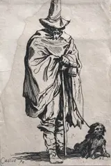 Man met hoge Italiaanse hoed in cape gewikkeld, blikje in de hand; een hond zit recht
