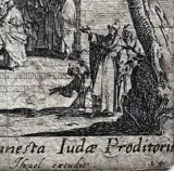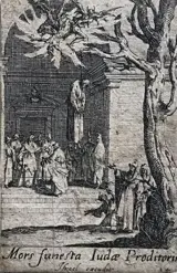 Onder het tafereel een onderschrift in het Latijn: "Mors funesta Iudae Proditoris"