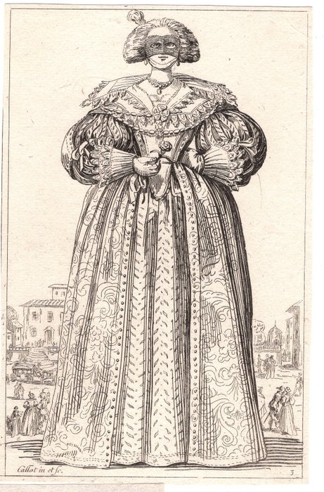 Tabel nr. 3 uit de serie "De adel", gegraveerd door Jacques Callot rond 1620-1623, onmiddellijk na de terugkeer van de kunstenaar naar Nancy. Plaat 3 van een serie van 12 etsen met de kostuums van de heren en dames van Lotharingen in de tijd van Callot. Ets ongeveer 142x92 mm op de randlijn met kleinere marges. Gesigneerd in de plaat linksonder Callot in et fe. Op geschept papier. Onbekend tijdperk.