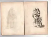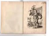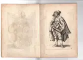 Van Les gueux (De Geuzen). Ets op geschept papier zonder watermerk 19x14 cm. 24 platen rechtsonder genummerd van 1 tot 24, daarentegen complete serie in 24 bladen uitgevoerd door Callot in 1622. Vergeleken met de suite van 25 platen ontbreekt degene die de twee pelgrims voorstelt. De 24 vellen zijn samengebonden met touw.