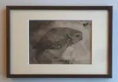 De heliogravure is in goede staat en wordt geleverd in de afgebeelde bruine houten lijst (zie detail foto) met een crème kleurige passe-partout.