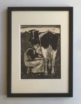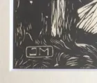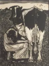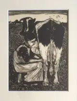 Originele Jan Mankes houtsnede Koemelkster, gesneden in 1914 en afgedrukt op dun Japans papier in 1927. Deze houtsnede zit in de lijst op het oorspronkelijke vel uit het boek. Monogram van Jan Mankes in de plaat.