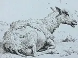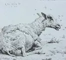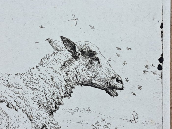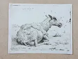 De afbeelding stelt een landschap voor met een liggend schaap met vliegen rond de kop, driekwartaanzicht en hoofd naar rechts gedraaid in profiel, vacht gedeeltelijk gespreid, een herder met schapen in de verte.