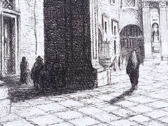 lino bianchi barriviera montebelluna 1906 acilia 1985. titel van het werk het pandjeshuis, de oude zetel van de bank. gesigneerd op plaat, gedateerd 1957, zeldzaam werk in goede staat, kleine insnijdingen aan de rand van het blad. Uit een privécollectie, uitstekende verpakking en verzending via koerier.