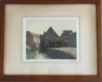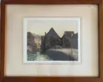 ingelijst met massieve houten lijst (enkele krasjes zichtbaar), achter antiek getrokken glas.