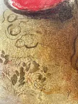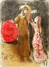 Marc Chagall heeft een suite van 5 stampes au chapitre sur Ruth gekozen; celle-ci est la troisième lithographie sur cette femme qui, grâce à son amour, sa confiance et sa persévérance andvers Booz, devint la femme de Booz et ainsi l'arrière grand-mère du roi David.