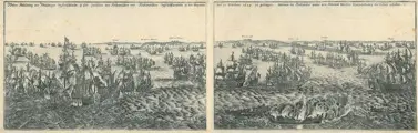 nZeeslag bij Duins tussen de Spaanse vloot onder bevel van Antonio de Oquendo en de Staatse vloot onder Maarten Harpertsz. Tromp, 21 oktober 1639. Grote, panoramische prent, naar een prent van Salomon Savery (1594-1683), naar ontwerp van Abraham de Verwer (1585-1650). Vervaardigd ca. 1650-1675.nnLinkerplaat met op de voorgrond op de spiegel gezien het admiraalsschip van Tromp de Aemilia naast de Santa Teresa die in brand staat. Op de achtergrond de Engelse kust tussen Romney en Dover. Afm. hele blad: 21.8 x 37.5 cm.nnRechterplaat met op de voorgrond een brandend schip en sloepen met bemanningsleden, rechts de veroverde Spaanse schepen. Op de achtergrond de Engelse kust tussen Walmer en Margate. Afm. hele blad: 22.2 x 37.9 cm.nnCatalogusreferenties:n- FMH 1805n- Hollstien 17, copy BnnGoede conditie. Papier met onafgesneden randen. Enkele kleine vlekjes/spotting. Lichte kreukjes. Verso: blank.nnZie ook de foto's.nnVerzekerde verzending.NULL NULL NULL 2023-02-22 09:19:59 2023-02-22 09:34:49