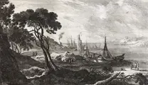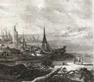 Kustlandschap, aanlegplaats voor vissersboten, een eeuwenoude toren, reizigers, op de achtergrond grazend vee