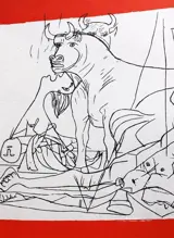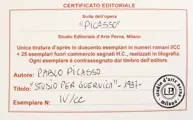 "Studie voor Guernica", een werk van Picasso uit 1937. Dit is een prachtige d'après-lithografie, cm.36,5 X 48, met blindstempel van de uitgever in het werk in de rechter benedenhoek en stempel in het garantiecertificaat. Het werk is afkomstig uit de kunstbundel: "Meetings with Picasso", uitgegeven door Studio Perna in 1962. De oplage is slechts 200 exemplaren met een enkel Romeins nummer I/CC + 25 drukproeven gemarkeerd met H.C. Het te koop aangeboden werk is nummer IV/CC