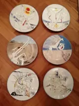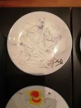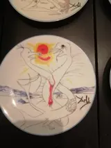 Set van 6 borden van porselein, limoges France. Met voorstellingen van La conquette du Cosmos van Salvador Dali. Allen gelijk genummerd 1175/4000 en voorzien van handtekening van Dali. In originele doos.